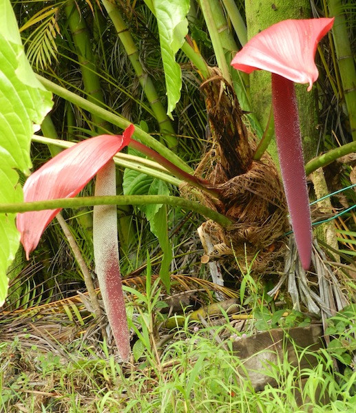 The spadix in the foreground has been pollinated a couple of weeks prior to this photo and its spathe is well into dieing back. Already the spadix has more than doubled its size as it starts the process of producing hundreds of seeds, but will not start to be visible for almost five months. The spadix in the background has recently been pollinated.